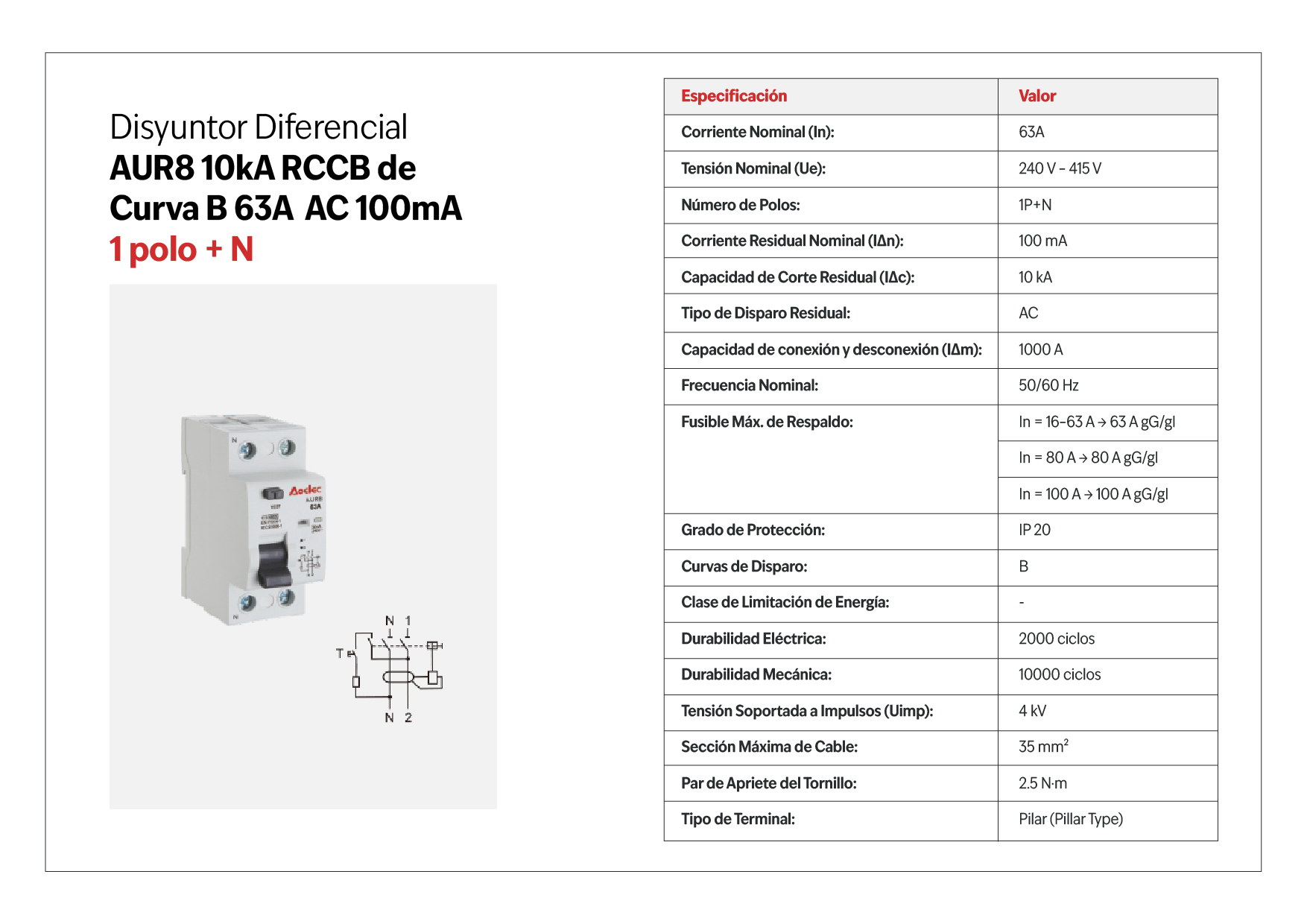 - Corriente nominal (In): Dependerá de la carga conectada (disponible en 25A, 40A, 63A, 80A y 100A).